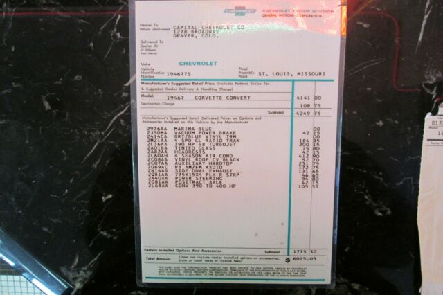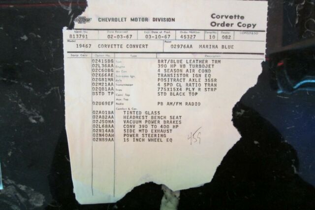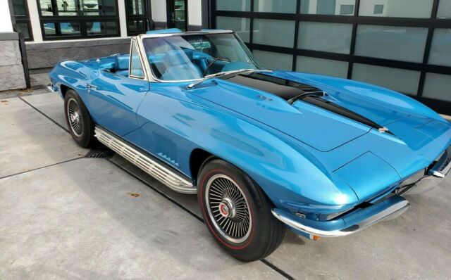 @import url(https://fonts.googleapis.com/css?family=Roboto); Vehicle Details Fantastic Blue on Blue 1967 Chevrolet Corvette Roadster, Extensive Body Off Restoration, 427/400 HP 3x2 bbl carburetor, 4 speed, Rare Factory AC, Side exhaust, Gorgeous blue bucket interior, Black soft top rolling on one year only corvette bolt on turbine rims. The Corvette Order Copy And Window Sticker Are Included. This amazing 1967 Tri-Power, Corvette has been is part of my car collection in a climate controlled environment and has had very few miles since restoration. EXTERIOR: Beautiful Blue Corvette convertible body with great panel fit and body lines, Correct factory big block hood with black stinger. The car looks amazing with the 1967 1 year only bolt on wheels and new red lines. Tinted glass and like new convertible top. INTERIOR: The Blue leather interior is absolutely gorgeous complementing the blue exterior. The seats, door panels and dash looks like new, The instrument cluster has clear crisp gauges and has a working AM/FM radio and clock. MECHANICS: Under the hood is a date code 427/400 HP with 3x2 intake and carburetors on top. 4 Speed, with rare factory Air conditioning, upgraded to a Be Cool Aluminum radiator, but have the original 4 core big block radiator in the box. Nicely optioned with power steering and power disc brakes. Vin number 194677S114460. This is a serious car for a serious buyer. Sold to me as a numbers matching engine by a reputable classic car dealer, but not independently verified. Please call or text 281-415-5857. Images Download the eBay Motors app