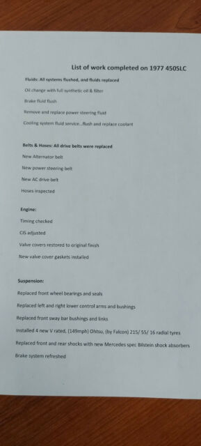 1977 Mercedes-Benz 450slc. Single family owned for over 30 years. California car it's entire life. Pampered by the owner until his passing. Absolutely zero rust top and bottom. Service records showing thousands of dollars spent on recommissioning the car. always garaged. Mechanically, in excellent condition. Body is in excellent condition. Paint is outstanding! Interior is very, very, nice. Can be driven anywhere. Clean Fla. title in my name.Very hard to find one of these in this condition. Great provenance. Happy to help coordinate shipping. Buyer responsible for all shipping costs. Fine Print, No warranty implied or given...Sold as is, where is.Happy to answer any questions you might have.Good luck Bidding...You won't be disappointed.On Feb-25-22 at 03:53:55 PST, seller added the following information:Further information you might find useful.This 450SLC benefits from having the 560sl sub frame installed. This was a factory fix for early 450sl's due to the original sub frames cracking from the weight of the V8...Also the 215/55/16 V rated tires on this 450slc are speed rated to 150mph and are the same diameter as the original 205/70/14 tires. Not sure if you can see in the pictures, but she also has installed new Bilstien shocks at all 4 corners.Please ask questions. Happy bidding.