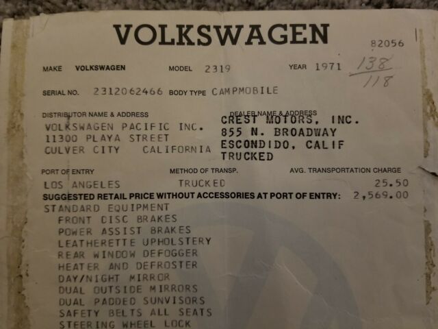 I bought this van in California in 1991 from the original owner's estate (See the original window sticker, owners manual, etc.). Was almost all original. The van has been garaged for 29 of the past 31 years. Virtually no rust except for a nickel sized hole in the battery box. Has never been driven in snow/ice/slush. Mileage:-92,680 when I bought it in 1991-118,100 in 2003 when it got a new engine (1600 bored out to 1915), transaxle, upholstery and paint (see documents).-119,200 after arriving in Colorado in 2003-120,769 current mileage.-2,627 total miles driven on the new engine and transaxle-1,527 total miles over the past 19 years in Colorado (two camping trips and the rest bi-weekly starting and driving short distances to keep the engine in shape).In the past few years I've installed a new muffler; new tires; new brakes; new dual Kadron carbs; new generator; new voltage regulator; new throttle cable; new brake lines; new fuel pump; new coil, battery, plugs, wires, and distributor. Everything on the van works: horn, radio (original), heat (not great), windows, seat covers, door locks, windshield wash system. The only things on the van that don't work are the rear window defrost, and occasionally the turn signal mechanism needs a gentle push back to the neutral position. There is a small star ding in the windshield that's been there all along. A few days ago I had a VW mechanic do a final tune on the carburation and timing and give a thumbs up that the van was mechanically sound--ready for sale.The van has a battery isolator and a newish deep cycle battery under the rear passenger seat. Headrests were installed on the original seats. The van starts strong in cold and hot conditions and shifts like a dream. Quick throttle response. Carbs jetted for Colorado elevation. Low elevation jets included. Seat upholstery in the back and covers in the front are immaculate. The original Westfalia camper package is aged but works fine and has just a few superficial blemishes.Included with the van are the original child hammock and the original rear door bug screen.Bottom line: This is a clean, mostly original van. It is NOT an IMMACULATE SHOW VAN, though it turns heads. The van is ready for the open road or as a daily driver. I wouldn't hesitate driving it cross country tomorrow. It will be hard to part with after 31 years but it's time to let someone else enjoy it.