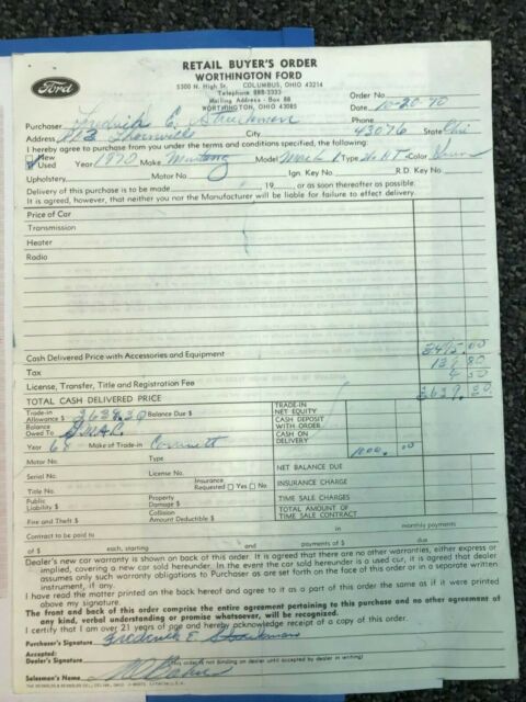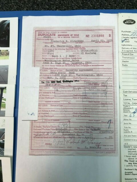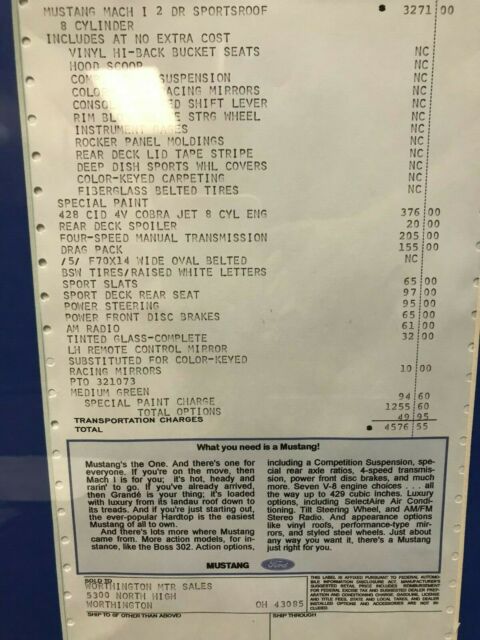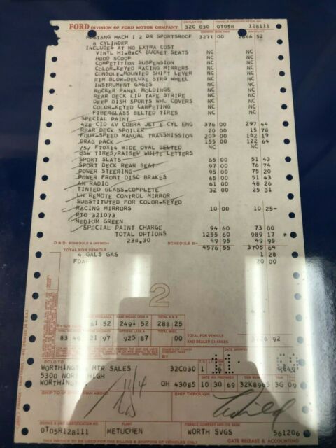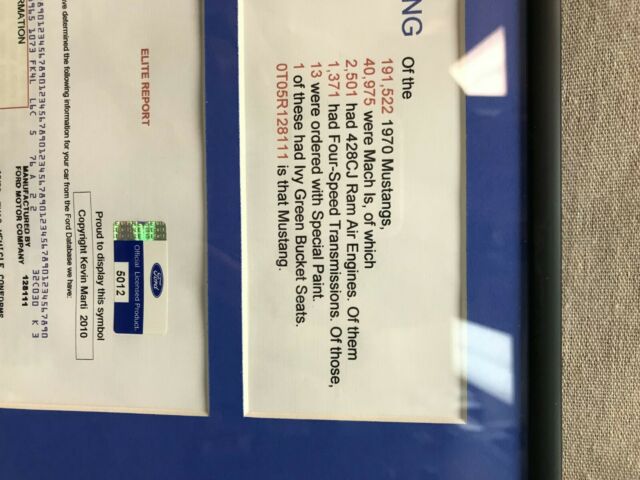This Mach 1 was purchased from the original owner in October, 2020. This 1970 Super Cobra Jet Mach 1 is a fine example of both period performance and preservation. It is a one-of-one as-equipped vehicle per the Elite Marti Report that was sold new at Worthington Motor Sales in Worthington, Ohio. This Mach 1 features the legendary R-code 428 Cobra Jet V-8 with Ram Air which is paired to the original close ratio 4-speed manual transmission. The original owner also opted to order the Drag Pack, an option that provided a 3.91-geared Traction-Lok differential. All of the pertinent Drag Pack equipment is original and intact! The Mach 1 was also factory-ordered with power steering and brakes and retains the original Mag-style hubcaps wrapped in Goodyear Polyglas tires. In addition, this Mach 1 features one of the rarest color options available for the 1970 Mach 1. Of the estimated 1,371 R-code/4-speed Mach 1s produced in 1970, it is one of only 13 produced in special-order Medium Green. Of those 13, it is the only one to be ordered with Medium Ivy Green clarion-knit vinyl bucket seat interior. The paint and interior are both original to the car, as are the factory sport slats and rear spoiler. The Hurst T-handle shifter and column-mounted Sun tachometer add a fantastic and subtle touch to the interior as well.The level of originality that this Mach 1 presents cannot be understated with the paint, interior, engine, Drag Pack equipment, carburetor, intake, transmission, bumpers, glass, smog equipment, jack and Polyglas spare tire all being factory-installed and/or applied. In addition to the aforementioned Elite Marti Report, it is offered with the original invoice and handwritten buyerâs order, gate release, Eminger Report, a copy of the original title, period Polaroid photos and letters from Ford Motor Company to the original owner. This Mach 1 is a fantastic unrestored and original example waiting to be driven. Pictures of the original tags are also included for your viewing pleasure. This is the real deal for any mustang enthusiast or collector. HIGHLIGHTS ï® Unrestored one owner car with 34,853 original miles ï® Factory Super Cobra Jet Drag Pack Mach 1 ï® One of one produced as equipped per Elite Marti Report ï® Sold new at Worthington Motor Sales in Worthington, Ohio ï® Original special order Medium Green paint, one 13 Mach 1s in this color for 1970 ï® Matching numbers R-code 428 Cobra Jet V-8 engine ï® Original carburetor and intake ï® Factory close ratio 4-speed transmission ï® Original 3.91 Traction-Lok rear end ï® Original Drag Pack equipment still intact ï® Power steering ï® Power brakes with front discs ï® Rear deck spoiler and sport slats ï® Original Medium Ivy bucket seat interior ï® Sport deck rear seat ï® Original owner's manual ï® Eminger report ï® Letters from original owner to Ford Motor Company ï® Period Polaroid photos ï® Original invoice and handwritten buyer's order ï® Copy of original title ï® Original gate release ï® Original smog equipment removed when new and preserved and will be included in the sale ï® Original Polyglas spare, jack and wheel in trunk