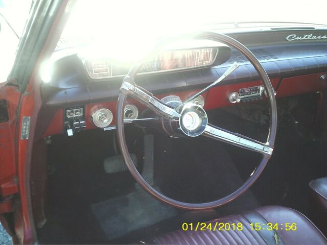 Available is a Cutlass Convertible w/ the 215 ci V-8 rated at 185 hp. Automatic Trans., Power Top. Car is pretty solid; the only perforation rust I observe is to the lower quarter panels, under the RH rocker molding, Top-rear of the RH fender, the rear of both front wheel-houses, and to the radiator support where it joins the RH fender apron. (In front of battery tray). The passenger floors and trunk floor appear OK. Otherwise, car is very straight, with a dent to the top of the LH quarter panel. This dent, plus damage to the original door was caused by a falling tree; In addition, the top bows suffered damage, with the best remedy likely being a replacement top frame assy. I have the windshield and the LH quarter window. Also the original LH door. The chrome on the car is surprisingly good; Bumpers are straight- rear has a patch of pitting. Have (1) original wheel cover. Car does roll and steer- Engine will need rebuilt or replaced. Interior only needs carpet and front seats recovered- Rear seat, door panels, dash and qt. trim are OK. Your inspection is welcome- car is located 50 miles north of Baltimore. I can be reached at 717 449 9583 for your questions. Pictures are current.