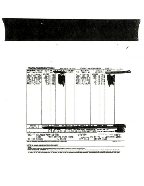 RARE 1974 Pontiac SD-455 4 speed Trans Am; 1 of 212 SD-455 4-speed Trans Amâs from the factory, Numbers Matching, PHS documented, Survivor with 60,857 miles. This Special Trans Am was updated many years ago by the previous owner. Updates included the addition of Air Conditioning, the Special Edition decal & striping package, Gold grill & headlight surrounds, Gold Honeycomb wheels, Gold engine-turned instrument panel and console trim, full gauges. The updates were inspired by Bill Mitchellâs SD-455 Trans Am Limited Edition car that appeared at the Chicago Auto Show in 1974! Air Conditioning was not an option for the SD-455 engines with a 4 speed transmission but the previous owner added it along with some of the other options outlined below. This is truly a special Trans Am, owned by a Pontiac enthusiast. The 1974 Pontiac Trans Am Super Duty 455 cars were the very last of the high performance cars from the '70s and the history of the Super Duty is legendary. The SD-455 has been accurately described as Pontiac's last stand and the last real muscle car. The SD-455 was a thinly disguised race engine: four-bolt mains, reinforced block, forged pistons, forged connecting rods, nitrided crankshaft, even a provision in the block for a dry sump oiling system. The legendary 455ci super-duty engines were literally hand-built race engines, as an off-assembly-line operation and were only available for 1.5 years of production. Highlights: - Last year of the SD-455 engines - 1 of 212 4-speed 1974 SD-455 - Admiralty Blue Exterior - Rare Black corduroy interior - Power Windows - Power Locks - Power Steering - Power Brakes - Air Conditioning - Tilt Steering (Gold) - Rear Console - Honeycomb wheels (Gold) - AM/FM/8 track Stereo - Rear Window Defroster - Lamp Group - 60,857 original miles - 3.42 Rear End Gear - 4 speed - PHS documentation - Warranty Booklets and Manuals - Excellent Condition This car has been recently serviced, new hoses, belt, has a new Gardner exhaust system, battery, and all brakes replaced. @font-face {font-family:Wingdings; panose-1:5 0 0 0 0 0 0 0 0 0; mso-font-charset:0; mso-generic-font-family:decorative; mso-font-pitch:variable; mso-font-signature:3 0 0 0 1 0;}@font-face {font-family:"Cambria Math"; panose-1:2 4 5 3 5 4 6 3 2 4; mso-font-charset:0; mso-generic-font-family:roman; mso-font-pitch:variable; mso-font-signature:-536870145 1107305727 0 0 415 0;}@font-face {font-family:Cambria; panose-1:2 4 5 3 5 4 6 3 2 4; mso-font-charset:0; mso-generic-font-family:roman; mso-font-pitch:variable; mso-font-signature:-536870145 1073743103 0 0 415 0;}@font-face {font-family:"Times New Roman \(Body CS\)"; panose-1:2 11 6 4 2 2 2 2 2 4; mso-font-charset:0; mso-generic-font-family:roman; mso-font-pitch:auto; mso-font-signature:0 0 0 0 0 0;}p.MsoNormal, li.MsoNormal, div.MsoNormal {mso-style-unhide:no; mso-style-qformat:yes; mso-style-parent:""; margin:0in; mso-pagination:widow-orphan; font-size:12.0pt; font-family:"Cambria",serif; mso-ascii-font-family:Cambria; mso-ascii-theme-font:minor-latin; mso-fareast-font-family:Cambria; mso-fareast-theme-font:minor-latin; mso-hansi-font-family:Cambria; mso-hansi-theme-font:minor-latin; mso-bidi-font-family:"Times New Roman"; mso-bidi-theme-font:minor-bidi;}p.MsoListParagraph, li.MsoListParagraph, div.MsoListParagraph {mso-style-priority:34; mso-style-unhide:no; mso-style-qformat:yes; margin-top:0in; margin-right:0in; margin-bottom:0in; margin-left:.5in; mso-add-space:auto; mso-pagination:widow-orphan; font-size:12.0pt; font-family:"Cambria",serif; mso-ascii-font-family:Cambria; mso-ascii-theme-font:minor-latin; mso-fareast-font-family:Cambria; mso-fareast-theme-font:minor-latin; mso-hansi-font-family:Cambria; mso-hansi-theme-font:minor-latin; mso-bidi-font-family:"Times New Roman"; mso-bidi-theme-font:minor-bidi;}p.MsoListParagraphCxSpFirst, li.MsoListParagraphCxSpFirst, div.MsoListParagraphCxSpFirst {mso-style-priority:34; mso-style-unhide:no; mso-style-qformat:yes; mso-style-type:export-only; margin-top:0in; margin-right:0in; margin-bottom:0in; margin-left:.5in; mso-add-space:auto; mso-pagination:widow-orphan; font-size:12.0pt; font-family:"Cambria",serif; mso-ascii-font-family:Cambria; mso-ascii-theme-font:minor-latin; mso-fareast-font-family:Cambria; mso-fareast-theme-font:minor-latin; mso-hansi-font-family:Cambria; mso-hansi-theme-font:minor-latin; mso-bidi-font-family:"Times New Roman"; mso-bidi-theme-font:minor-bidi;}p.MsoListParagraphCxSpMiddle, li.MsoListParagraphCxSpMiddle, div.MsoListParagraphCxSpMiddle {mso-style-priority:34; mso-style-unhide:no; mso-style-qformat:yes; mso-style-type:export-only; margin-top:0in; margin-right:0in; margin-bottom:0in; margin-left:.5in; mso-add-space:auto; mso-pagination:widow-orphan; font-size:12.0pt; font-family:"Cambria",serif; mso-ascii-font-family:Cambria; mso-ascii-theme-font:minor-latin; mso-fareast-font-family:Cambria; mso-fareast-theme-font:minor-latin; mso-hansi-font-family:Cambria; mso-hansi-theme-font:minor-latin; mso-bidi-font-family:"Times New Roman"; mso-bidi-theme-font:minor-bidi;}p.MsoListParagraphCxSpLast, li.MsoListParagraphCxSpLast, div.MsoListParagraphCxSpLast {mso-style-priority:34; mso-style-unhide:no; mso-style-qformat:yes; mso-style-type:export-only; margin-top:0in; margin-right:0in; margin-bottom:0in; margin-left:.5in; mso-add-space:auto; mso-pagination:widow-orphan; font-size:12.0pt; font-family:"Cambria",serif; mso-ascii-font-family:Cambria; mso-ascii-theme-font:minor-latin; mso-fareast-font-family:Cambria; mso-fareast-theme-font:minor-latin; mso-hansi-font-family:Cambria; mso-hansi-theme-font:minor-latin; mso-bidi-font-family:"Times New Roman"; mso-bidi-theme-font:minor-bidi;}.MsoChpDefault {mso-style-type:export-only; mso-default-props:yes; font-family:"Cambria",serif; mso-ascii-font-family:Cambria; mso-ascii-theme-font:minor-latin; mso-fareast-font-family:Cambria; mso-fareast-theme-font:minor-latin; mso-hansi-font-family:Cambria; mso-hansi-theme-font:minor-latin; mso-bidi-font-fam