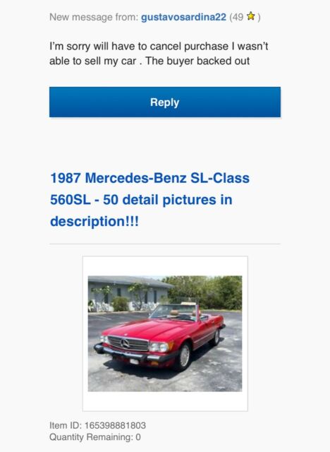 Back on sale!!!! Buyer never show up and ruined auction!!! For sale 1987 Mercedes 560SLCar runs and drive.Body is great conditionNo rust.Very presentable carClean underneath.I think all pictures showing you exactly what is the condition of this car so please check all pictures and video.Recently rebuild fuel distributor.Comes with hard top and good soft top no tears or rips.Odometer works (trip meter no) original milesI have clean FL title in hand.I can help with transport35 years old car for sale AS-IS where is it. no warranty no returns.Inspection welcomeOnly serious buyer!Buy now deposit immediately!If you send offer please send in notes your phone number otherwise will not accept offers!I can help with transport.Inspection: Always welcome a buyers inspection. If you plan to have a buyers inspection, please make sure you inspect the vehicle prior to the auction ending. Inspection fees if any are Buyers responsibility.Representations and Warranties made by seller: This vehicle is being sold "as is"No representations or warranties are made by seller, no any representations or warranties relied upon by bidders in making bids. 1987 Mercedes 560SL Video will open in a new window Using the mobile app? Copy this link into your browser: .ft_vid { margin:.5em auto 0 auto; max-width:480px; font-family:arial; text-align:center; position:relative; min-height:120px; overflow:hidden; background-color:#555; }.ft_vid p { position:absolute; margin:0; color:white; background-color:rgba(0, 0, 0, .5); }.ft_vid .ft_vid_head { font-size:16px; width:100%; height:28px; line-height:28px; text-align:left; top:0; left:0; padding-left:10px; overflow:hidden; }.ft_vid .ft_vid_foot { font-size:11px; width:100%; bottom:22; left:0; }.ft_vid img { display:block; max-width:100%; border:0; }.ft_vid a:after { content:"\A0\25BA"; position:absolute; width:60px; height:50px; left:0; top:0; right:0; bottom:0; margin:auto; border:0; border-radius:10px; color:white; background:rgba(0, 0, 0, .6); font-size:24px; line-height:50px; cursor:pointer; }.ft_vid a:hover:after { background:#CC181E; }.ft_lnk_div { margin:-10px auto 0.5em auto; padding-top:5px; max-width:480px; font-family:arial; font-size:12px; text-align:center; position:relative; color:black; background:whitesmoke; }.ft_lnk { /* position:absolute; */ top:100%; left:0; width:100%; text-align:center; padding:.5em .2em; border:0; background:whitesmoke; }