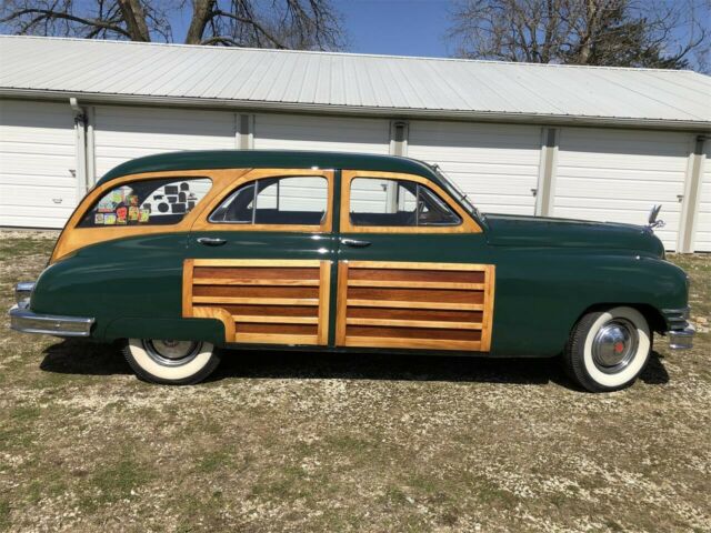 Packard joined the Woody market after the war with its Station Sedan. Built on the 22nd series platform this is a steel bodied car with the wood attached, except the tail gate which is on a wood frame. This '49 is a 20-year-old cosmetic restoration with very good paint, big chrome and interior. The engine was not rebuilt and when I bought it, I expected to do a rebuild. But, after I drove it a while, I found the 288 c.i. in-line 8 runs and starts well. It burns a little oil but is so smooth that I decided to leave it alone. Three speed manual transmission provides plenty of torque for the 130 h.p.The small exterior chrome handles and light frames have not been rechromed and would need it for a show quality car. There are two non-original brackets on the tailgate that were there when I bought the car. The entire back section is very solid. The speedometer and odometer do not work. It shows 58,000 miles but that is not correct. The dashboard wood graining is spotted and showing its age.Topping it off is the majestic Cormorant hood ornament that looks projects Packard elegance. The interior is period correct and in great shape. Packard Sylvan Green is a great complement to the Northern maple wood trim.This is a fun driver and definitely will be the only one you'll see at any car gathering.