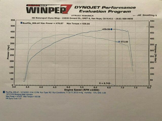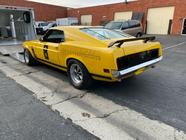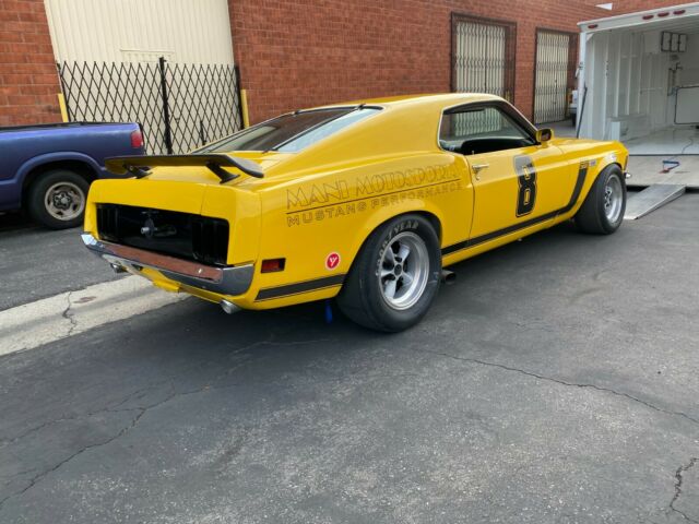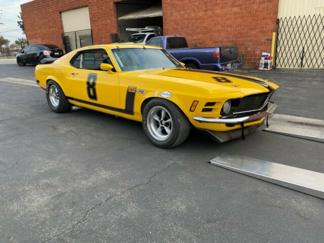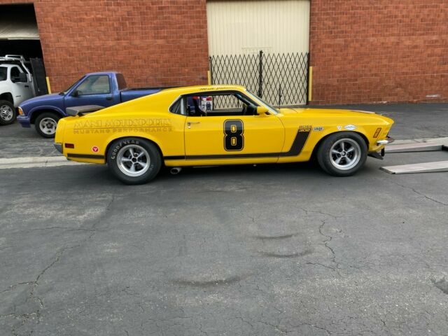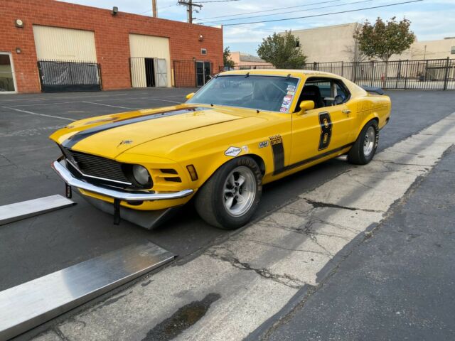 1970 Ford Mustang Sportsroof âBoss 302 Trans Amâ Race Car This car is as clean as they come and was built by Dave Maniof Mani Motorsports as his personal race car so the attention to detail andquality of the build is top-notch. Itâs ready to run with a new motor, rebuilttransmission and less than 20 hours on the chassis since full rotisserierestoration. Full specs belowâ¦Engine: Brand new World Products Man OâWar Ford 351Wbored 0.040 and modified for dry sump operation. Rebuilt Racing Head Servicealuminum heads with new exhaust valves, springs, seals, etc. JE forged pistons(12.5:1), Eagle H-beam rods, SCAT forged crank, Comp Cams solid roller lifterwith 256/258 duration and .740 lift, TD shaft-mounted rockers, Holly HP 750 CFMcarb, Holly single-plane air gap manifold, Hooker Super Comp headers, ARPfasteners throughout, HP1 bearings, Cloyes billet timing gear set, Stewartwater pump, Weaver Bros 3-stage oil pump with Petersen 12-qt tank and 3 oilfilters, brand new Ron Davis custom radiator, and the list goes. Break-in and dyno time only on the motor. Dynoâd in the caron 12/19/21 and put down 478 HP and 430 FT-LBS on a Dynojet. Transmission: Freshly Rebuilt Jerico 4 speedwith 2.0, 1.6, 1.3, 1.0 gearing. Hurst shifter with Shiftdoc rebuild, newTilton 3 disc clutch, new Tilton flywheel, new Quartermaster hydraulic TObearing.Suspension: Just corner balanced by Maier Racing.Front suspension is original upper and lower a-arms, uppers lowered 1¼ inchwith Maier urethane bushings, lowers are boxed with monoballs, upper and lowerHowe Racing ball joints, caster adjustable strut rods with monoballs,Opentracker double roller spring perches, double adjustable Alston shocks withcustom valving and 900 lb springs, tie rod ends are stock with aluminumadjusters and heim joints, custom idler arm, reinforced drag link and 16:1 OEMsteering box. Rear suspension has Maier 200 lb leaf springs with staggeredleafs, stock front bushings, custom AFCO leaf spring sliders in the rear, FAYS2Watts Link, double adjustable QA-1 shocks, 9â Ford rearend with 31 spline axlesand O-ring outer axle bearings. Brakes: Front are period correct discs with â67T-bird/Lincoln calipers and spindles, Wilwood hats and Coleman rotors,Porterfield pads. Rear are period correct discs with â66 Mustang frontcalipers and rotors, Porterfield pads. Two brake bias adjusters, one hydraulic on interior centertunnel and one cable for master cylinder bias bar installed on dash.Other: Full Stewart Warner gauges and custom wiringharness with Painless fuse box and Odyssey battery. Complete Cool Suit systemfor shirt and helmet (air). Fuel Safe 16 gallon fuel cell with 2 Holley blacktop fuel pumps and vintage FRAM canister filter. ESS 10 lb (5 L) AFFF firesuppression system with 2 zones - engine compartment and driver. Currentlogbook with CSRG, VARA and SVRA entries.Spares: Twosets of racing wheels (one set of Torq Thrusts and one set of Minilites) andone set of storage wheels/tires. One set of OEM 31 spine used axles in greatcondition. Two additional sets of front springs. Misc spares such as sparkplugs, lug nuts, wheel spacers, etc. Sold on Bill of Sale. Happy to answer any questions or sendadditional photos. The car is located in Gardena, CA and is available forinspection.