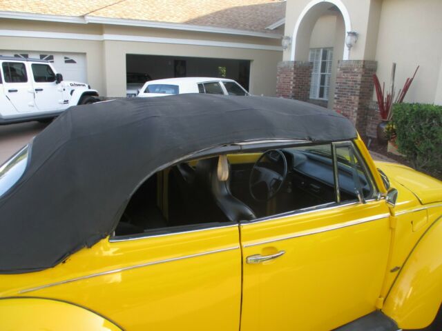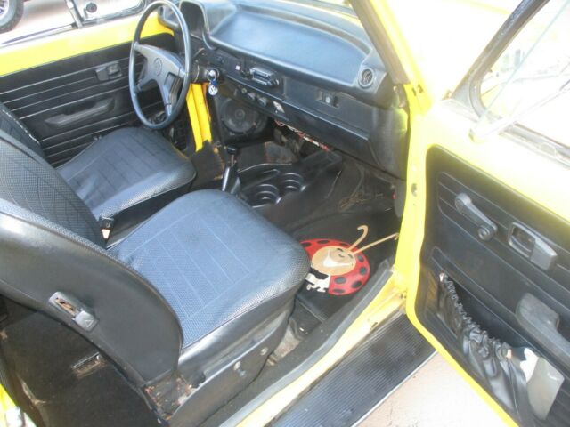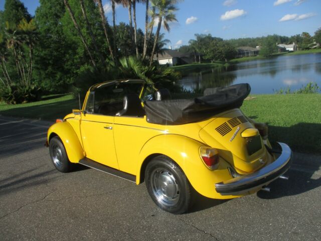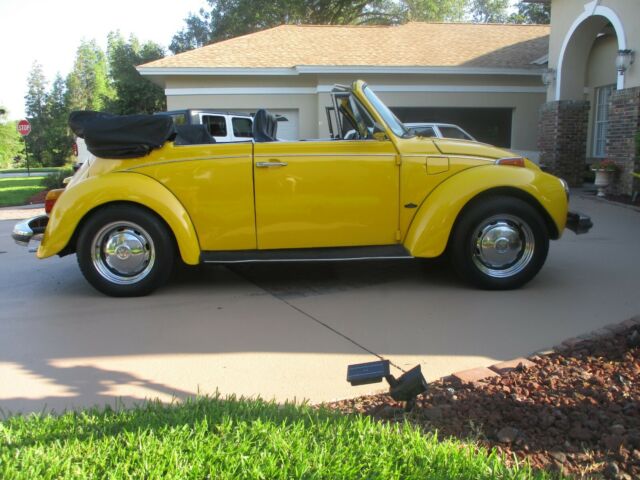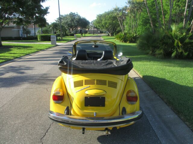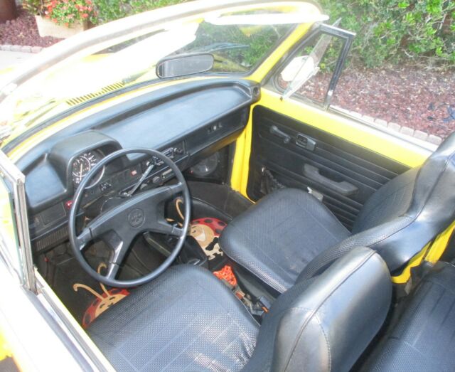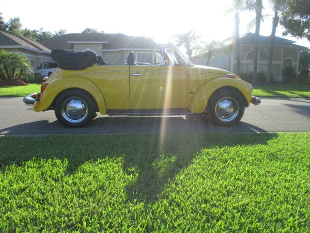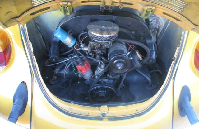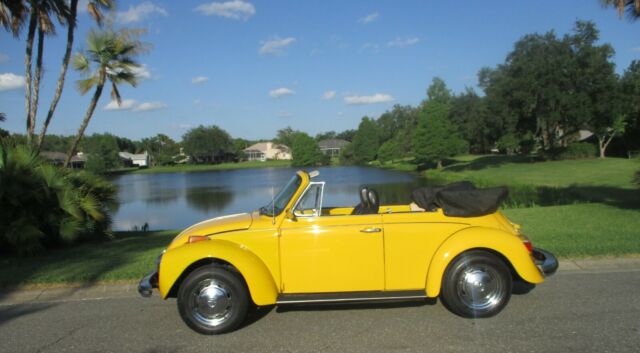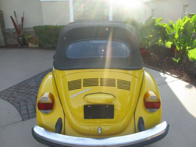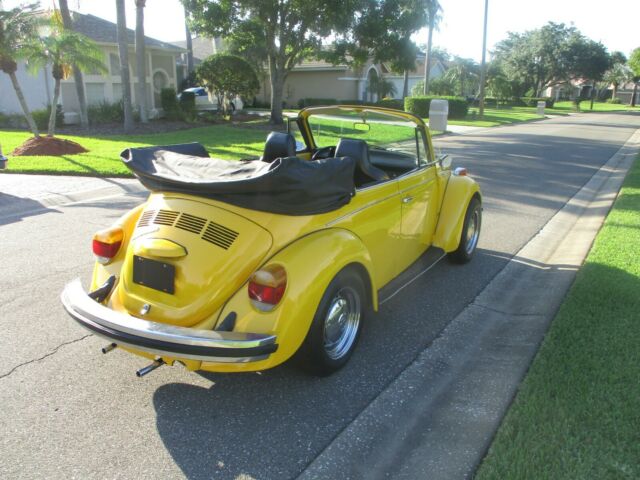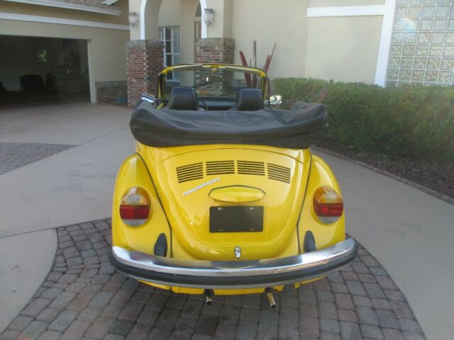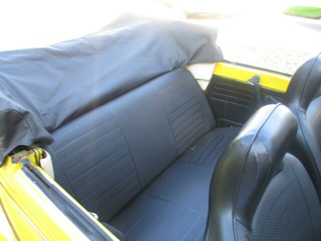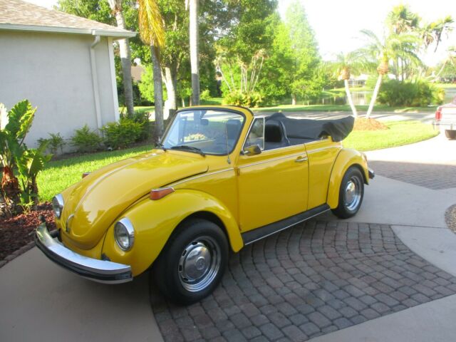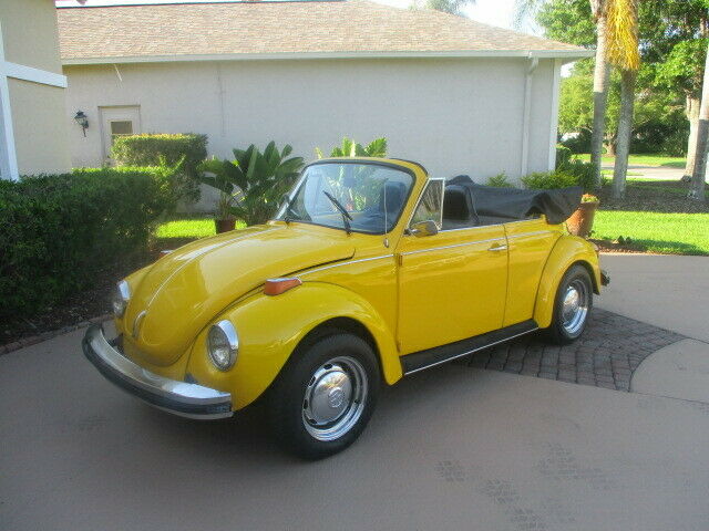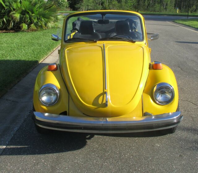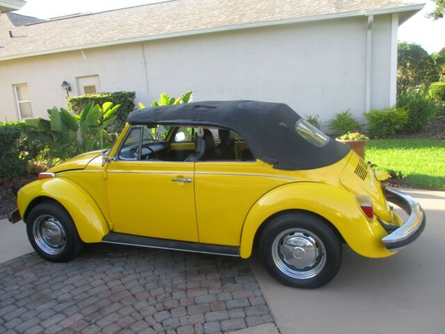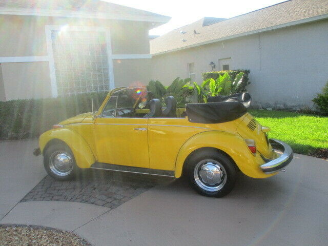 1975 VOLKSWAGEN BEETLE CONVERTIBLE WHAT A BEAUTIFUL BEETLE THIS IS VERY PRETTY COLOR COMBINATION YELLOW WITH A BLACK INTERIOR AND A BLACK CONVERTIBLE TOP THIS BEETLE COMES WITH A NEW CONVERTIBLE TOP WITH HEADLINER STILL IN THE BOX THE TOP THAT IS ON IT NOW IS STILL OK, BUT IF YOU WANT TO PUT A NEW TOP ON IT THERE IS ONE THAT COMES WITH THE CAR ( see pics) THIS BEETLE HAS A GREAT BODY AND A GREAT PAINT JOB VIEW ALL PICS I TOOK PICS AT ALL ANGLES TO SHOW YOU HOW NICE IT IS , It is not perfect but it is nice view all pics , the paint has a great glossy shine and looks great the interior is very nice and very clean, has the beetle bug floor mats , the trunk (tounge) is very clean and nice and comes with a spare tire, the engine looks great , the chrome wheels are in great shape, the underneath is clean the convertible top that is on it now functions fine and looks ok, it has 3 sections on the drivers side where the vinyl i has peeled the underneath is still there and and the insulation is still there its just cosmetic, This beetle comes with a new top in the back seat along with the headliner and insulation if you wish to replace the top also has new latches for the top, this beetle is a blast to drive and when the top is down it is just a pure pleasure to drive it it sure gets the attention everyone always compliments on this car , the yellow is a real head turner its the best color for the beetle and the sound of that chirpy little engine is so much fun to hear , this beetle is available to view and inspect at anytime before purchase , like all classic cars this car is sold as is no warranty I have a great buy it now price on this beetle and best of all it will be delivered right to your door FREE OF CHARGE ! YES ! FREE DELIVERY ! Usually takes anywhere from 3-7days depending on your location, i will keep you informed through out the whole transaction until delivered. there is a $500.00 non refundable deposit at time of purchase, if any questions 765 969 7393 bill serious calls only please.