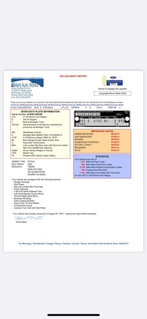 @import url(https://fonts.googleapis.com/css?family=Roboto); About this vehicle This 1975 Ford Bronco is an original. The owner has had it for 1 year. The vehicle runs great and is mainly used for weekend drives. Vehicle Details This 1975 Ford Bronco Ranger is a solid survivor Bronco. Has spent its entire life in Arizona with two previous owners. The first owner owned it from 1975-1982 and the second owner owned it from 1982-2022. The second owner passed away and I purchased it from his wife. Has the stock 302 V8 and automatic transmission. Under the hood is as clean as I have ever seen one that is unrestored. It appears to be wearing its original paint and has a lot of patina. It is rust free. The inner quarter panels, rockers, kick panels and all the other common rust areas on broncos are all rust free. The body is solid and straight and the body lines look good. The doors open and shut like they should, windows go up and down and all the lights and gauges work correctly. The interior is original and the seats are all in good shape. The drivers seat needs vinyl repair but the original houndstooth material is good. The door cards are original and are in decent shape. I tore all the old carpet out and have ordered new carpet and underlayment and tack down strips, just waiting for it to be shipped. I also have a new dash pad or a dash pad overlay cover ordered one of which will be included in the sale. The frame looks great and all the body mounts are clean and look solid. I have the original owners card and a warranty pamphlet and the owners manual. Also the Deluxe Marti Report is in the photo gallery. If you need any additional photos or have questions feel free to reach out. This would be a solid bronco for a collector or if you want to restore a Ranger Package Bronco this is probably the best color and a great foundation for something special! Clean and clear Missouri Title in me and my wifeâs name. Exterior Interior Engine Download the eBay Motors app