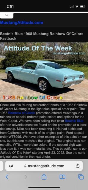 @import url(https://fonts.googleapis.com/css?family=Roboto); About this vehicle This 1968 Ford Mustang is an original. The owner has had it for 1 year. The vehicle runs great. Vehicle Details Up for sale is a rare 68 Mustang Fastback This Mustang was one of the special paint cars from the Rainbow of Colors promotions done on the West Coast in 1968. Recent paint job in the factory special color of Beatnik Blue. Factory 289 C code 2v and auto trans drivetrain that runs great. The car was in CA all the years prior to early 2021 when it was bought to Georgia. The car retains a large amount of the original factory metal and underside. New carpet, dash pad, headliner and mechanical servicing done in the last 6 months. Still retains the original CA black plates along with the selling dealer license plate frame. Original bumpers still on the car. 1980 Disneyland park pass on rear view mirror. The car can be enjoyed right now. Could use a new muffler and tailpipe (new tailpipe included or will be installed prior to sale) I have a great shipping contact if needed. Driving video available on request If you need any additional pictures please let me know. If you make an offer please have funds available to purchase if your offer is accepted. The Mustang is sold as is and Iâve done my best to describe and photograph it. Preferred payment is a bank wire transfer or a certified check. Vehicle doesnât leave here till check clears. Exterior Interior Engine Download the eBay Motors app