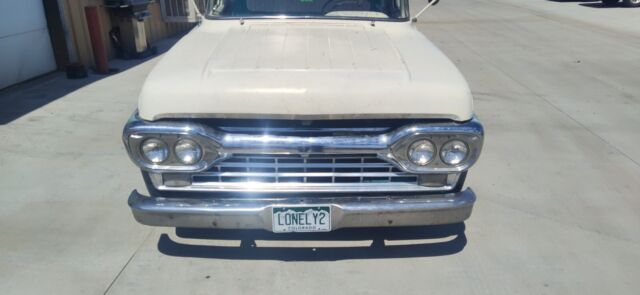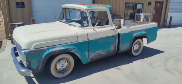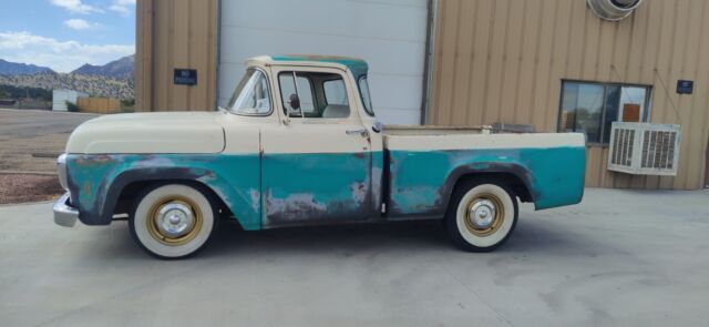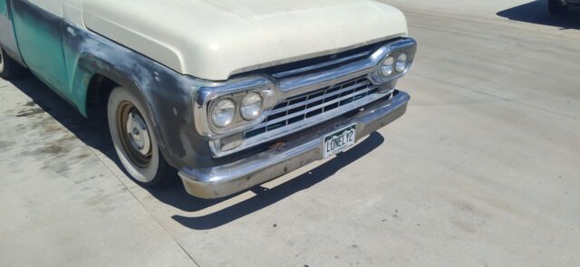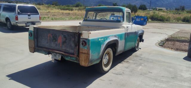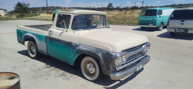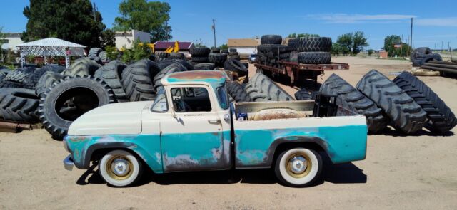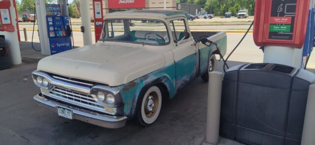 For sale is a pretty darn solid truck. It is a '60 with a '57-58 F100 hood. I use it as a daily driver. There are still a few small spots that need to be fixed, but it's 98-99ish percent rust free. Good running 223 6 cylinder and 4 speed transmission. This truck goes 65 miles an hour happily down the highway, but it doesn't go much faster than that. The speedometer is right on the money, and a new cable was installed last year. It's a great truck for parts getting around town! Great brakes, and the emergency brake works! New front cab mounts and floor sections, carpet, fancy tuck n roll seat with beautiful gold piping to match the wheels, door seals, window fuzzies, windshield, windshield rubber, pertronix ignition, spark plugs, wires, electric fuel pump and pressure regulator, carburetor, air filter, master cylinder, wheel cylinders, clutch master cylinder, rear shocks, wide whites and dogdish caps. All new within the last year. Cool '50's style space inspired pinstriped dash and chrome goodies! I would like to keep the chrome heater cover and will install a stock painted one. I'm selling because I've got another fridge truck to build and a paint booth to put up. I hate to do it, but this one's gotta go! It's the perfect little shop truck, and I'm going to cry when it goes, but c'est la vie! Clean CO title. Located in beautiful Canon City Colorado. Price is firm, so buy it before it's too late, as the patina is great and it's a bitchin' little truck! $1,000 non-refundable deposit due immediately when you click "Buy it now". Shipping is your responsibility. If you live in Colorado, I think you could drive it home if you'd like. Feel free to call me at (218) 770-5795 with any questions about this '60 F100!