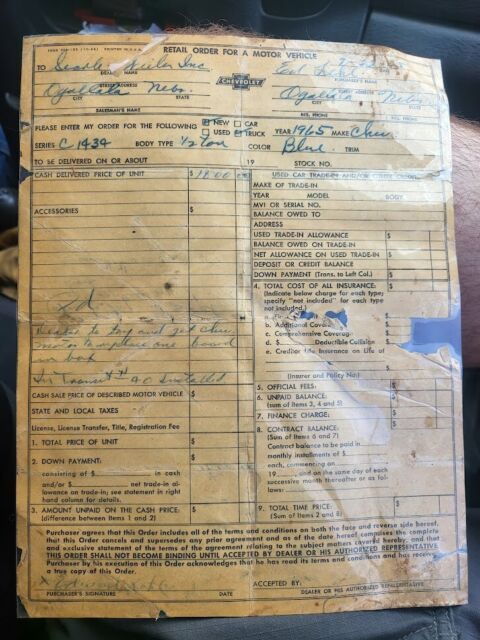 1965 Chevrolet C10 shortbox fleetside with 23k original miles with the original purchase contract! 1 family owned, 2 owners. Factory High Torque 230 inline 6 with 3 on the tree. Body and frame is solid! Body has a couple dings and scratches down the side. Interior is like a time capsule, little wear but overall very good condition. Tires seem to be the original tires so I left them on truck and even has the original spare rim and tire as well! Previous owner had lost 2 of the original hub caps. This is just a super cool, survivor classic truck, that is very hard to find this original, in this condition. I have not touched the paint with anything besides water and soap. Brakes, antifreeze, fuel system, light and blinkers all just gone through. Underneath is just as solid as the body. Please email me or message me on here and I can send you a link to more detailed pictures. Please look over all the pictures well and if you have any questions, please don't hesitate to ask! I take great pride in the cars we sell and represent. Ask for more pics if you want to see anything specific or for videos, when available, all PRIOR to the end of the sale. We welcome questions, and any inspections prior to the end of the auction. Car may be listed locally and may end early. Clean, clear title in hand. Car sold as is with no warranty expressed or implied. $1000 deposit required through Paypal or ebay within 24 hours upon sale, or other arrangements made. Balance via wire, cashiers check, or cash in person within 3 days unless other arrangements are made via call or email. International buyers welcome and have assisted in sending several to different countries this year alone. Give me a call. Jake 402. 340. 6505 or email kubikauto20 at gmail dot com