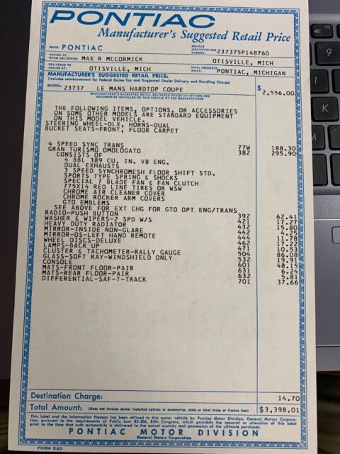 1965 Pontiac GTO project car-needs assembly, I bought it with the intention of finishing it. That will not happen anytime very soon so I have decided to sell.Documented real 65 GTO-see original window sticker in the pics, have other PHS docs as well.Not original Tri-Power car-Engine has been completely rebuilt-paperwork on engine in pics-Engine is not original to the car it is a 1963 389 Block but it is fresh with Tri-Power-4 speed transmission as well.Car was painted when I purchased. I have not done anything to this car. It just needs a new homeThere are many new parts-please feel free to get with me with any questions-eight one three 789 six one seven nineHere is a list of the parts that are included with the sale of the carDESCRIPTION QTY · Hood Hinge hardware kit 1 New · Set - Headlight bezel screws 1 New · Master body hardware kit 1 New · Door drain seals 4 New · Set - Seal/glass run channel 1 New · Set - Window felt kit 1 New · Set - Lock pillar/door jamb U-seals 1 New · Clutch 1 New · Clutch throw-out bearings, retainers, operating rods hardware New · Glass Set - Windshield/Rear window Door/Qtr. glass 1 New · Rad support and inner fender screw kit 1 New - 32 pcs · Hurst Competition Plus shifter 1 New - 4spd w/shifter handle · Fender and Wheelhouse hardware kit 1 New - Incl: 44 bolts, 10 U-nuts · Set - gauge lenses - clear 1 New - includes tach telltale · Set - Door weatherstrip 1 New, C-10694-100A · Trunk weatherstrip 1 New, C-12269-100B · Set - Door weatherstrip 1 New, Sponge Supersoft, W5004 · Set - Roof rail seal/weatherstrip 1 New, Sponge Supersoft, W5005 · Set - inner seat mount brackets 1 New, weld in - not installed on new floor · Front bumper 1 Re-chromed · Rear bumper 1 Re-chromed · Body mount bushings 4 New · Set - Sill plates 1 New · Set - Roof drip rail moldings, L & R 1 New · Set - door panel retainer molding 1 New · Set - rear panel retainer molding 1 New · Set - door ledge reveal molding 1 New · Dash pad - Black 1 New w/hardware · Set - headliner w/rear quarter pieces - Black perforated 1 New · Set - Headliner bows 1 New · Set - Front seats - Black original style 1 Re-covered · Rear seat bottom - Black original style 1 Re-covered · Rear seat back - Black original style 1 Re-covered · Set - Rear seat back anchor brackets 1 New · Rear package shelf - Black 1 New · Set -Rear package shelf ends - black 1 New · Carpet - Black 1 New, original style for 4spd/non console car · Set - door and rear interior panels L & R - Black 1 New, original style · Glove box liner 1 New · Set - Glove box lock/key 1 New · Set - Door lock/Ignition cylinder/keys 1 New · Ignition switch 1 New · Hood scoop / insert 1 Painted · Cowl panel 1 Painted · Core support/grill trim panel 1 Painted · Engine - 389cid w/tri-power 1 · Transmission - 4 Spd 1 · Left rear tail light housing 1 · Right rear tail light housing 3 · Set - hood hinges 1 · Left door window regulator 2 · Right door window regulator 1 · Left rear window regulator 1 · Right rear window regulator 1 · Set - front bumper brackets: 1 · Grill "T-support" bracket 1 · Set - Tail light lenses 1 · Head Light buckets 10 · Headlight bezels 2 · Set - wheel opening moldings 4 · Headlight trim rings 1 · Set - Grill inserts, left and right 1 · Tail panel center trim 1 · Set - Front seat outer chrome trim 1 · Rearview mirror/bracket 1 · Set - Factory gauges 1 · Set - Chrome visor mount brackets 1 · Dash bezel / housing 1 · Glove box door 1 · Dash - Heater control head 1 · Set - Dash trim w/ash try 1 · Pass grab handle 1 · Cigarette lighter w/housing and bezel 1 · Wiper/washer knob 1 · Headlight knob 1