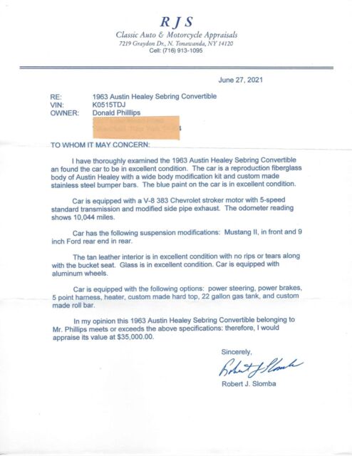 1963 Sebring 5000 Healey Paint & Color - DUPONT CHROMABASE Base Coat.Body â (Built in 2001 By A Local Race Car Builder/Driver) A 2001, 1963 Sebring 5000 Fiberglass Retro Manufactured Body by Classic Roadsters w/ Flared Wheel Arches. Built w/ a Sebring VIN# Mounted on The Driverâs Side Firewall & Working Vented Fenders. Optional Hard Top Which Is Removable. Interior â Custom Upholstered SUBURU Seats w/ RJS Racing 4 Point Seat Belts and Matching Leather Door Panelâs & Dash Pad and A Custom Rug w / Matching Floor Mats. Roll Bar That Is Removable. Vintage Auto Meter Gauges Which Include Speedo, Tach, Fuel, Temp, Volts and a L/R 02 Sensorâs All Imbedded into a Custom Refinished Wood Dash Accented w/ a GRANT GT Steering Wheel. Motor â 383 Stroker, Forged Pistons, Flat Tappet Hydraulic Cam, Trick Flow Heads, Roller Rockers, Offenhauser Dual Quad Manifold set Up w/ Dual AFB 500 Carbs, approx. 425 H.P. (SUNOCO 93 Ultra & Hot Rod Oil 10W40 5 Quarts ($41.99) & WIX Part#51060 Oil Filter ($10.99) @ Summit Racing. Transmission â BorgWarner T5 Transmission (Use only ATF Fluid). Chassis â Square Tube Chassis w/ A Ford 9â Rear End Using Eldorado Brakes. Mustang II Front End using G.M. Calipers & Brakes. American Racing Wheels AR23 Aluminum Rims Mounted w/ BF GOODRICH TAâs P245/R15 On All Four Corners. Added Rare Options â Locking Trunk, Wipers, Tilt Wheel, Keyless Entry w/ Emergency Backup Button Release Near the Battery Mounted in The Trunk If Keyless Remote Should Stop Working. Working Heater & Defrost That Works as Good as Any New Car! Market Value Appraisal (NOT A INSURANCE Appraisal) - $35KUSDWalk around video: https://youtu.be/LUbGOP5ryaECold Start video: https://youtu.be/vDWhDKB4oT8 Don 716 -Eight Seven Zero - 30 Seventy One
