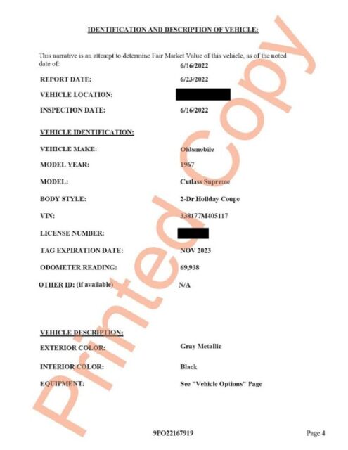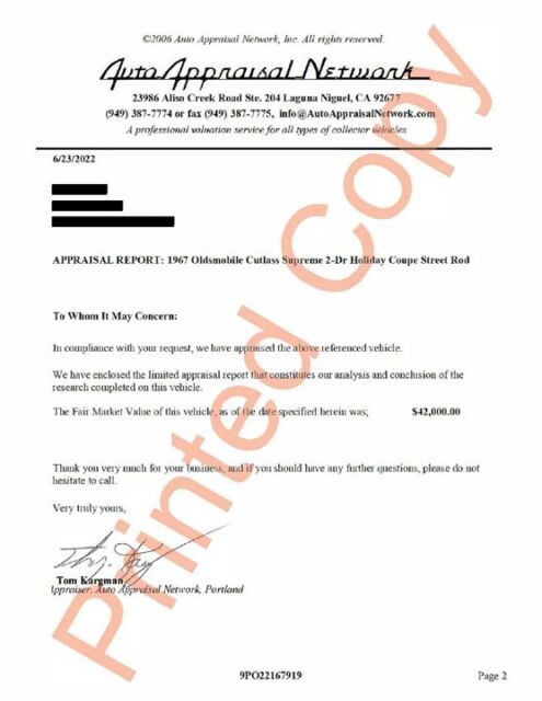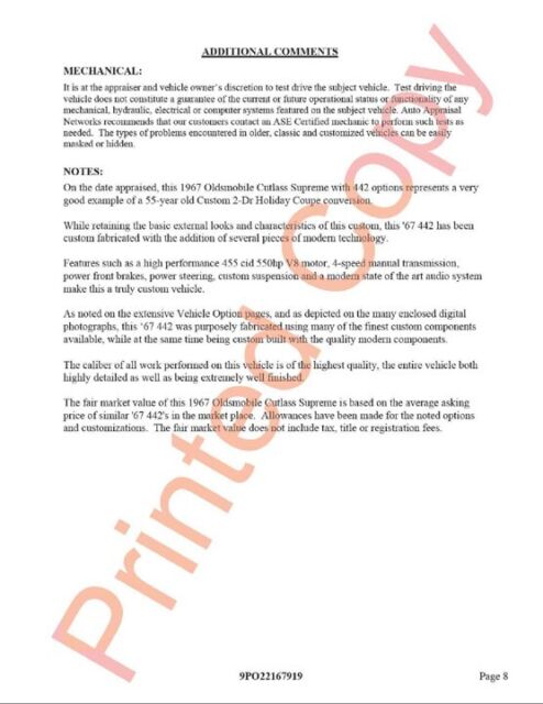 1967 OLDSMOBILE 442 CUTLASS SUPREMEAn appraisal was done by Auto Appraisal Network on 6/16/22. The full appraisal will be shared upon request.Appraised fair market value is $42,000SUMMARY FROM APPRAISAL"On the date appraised, this 1967 Oldsmobile Cutlass Supreme with 442 options represents a very good example of a 55-year old Custom 2-Dr Holiday Coupe conversion. While retaining the basic external looks and characteristics of this custom, this '67 442 has been custom fabricated with the addition of several pieces of modem technology. Features such as a high performance 455 cid 550hp V8 motor, 4-speed manual transmission, power front brakes, power steering, custom suspension and a modem state of the art audio system make this a truly custom vehicle. "As noted on the extensive Vehicle Option pages, and as depicted on the many enclosed digital photographs, this '67 442 was purposely fabricated using many of the finest custom components available, while at the same time being custom built with the quality modem components. The caliber of all work performed on this vehicle is of the highest quality, the entire vehicle both highly detailed as well as being extremely well finished. The fair market value of this 1967 Oldsmobile Cutlass Supreme is based on the average asking price of similar '67 442's in the market place. Allowances have been made for the noted options and customizations. The fair market value does not include tax, title or registration fees."VEHICLE OPTIONS442 option package,Aluminum radiator,Aluminum water pump,Balanced and blueprinted 455 cid 550 hp V8 motor,Holley 850cfm carburetor,Edelbrock Hi-Rise aluminum intake manifold,Chrome air cleaner,Mondelli heads,Aluminum valve covers,Double spring roller rockers,Chrome alternator,Traction control system,Rev limit protection,Mallory distributor,HEI ignition,Exhaust headers,Hi-torque starter,Moncello oil pan,Power steering,Power front disc brakes,Front sway bar,Cowl induction hood,4 speed manual transmission,Hurst floor shifter,Autometer auxiliary gauges,Mallory tachometer,Pioneer AM/FM stereo,Bench seats w/seat belts,Vinyl top,12-bolt rear-end w/ladder bars,15" Rally wheels w/trim rings and center caps,Cooper 275/60-RlS tires,442 exterior badges,Chrome rear bumper,Dual exhaust w/Flowmaster mufflers,Gray Metallic exterior paint.