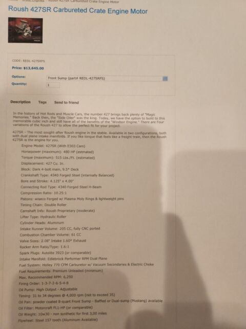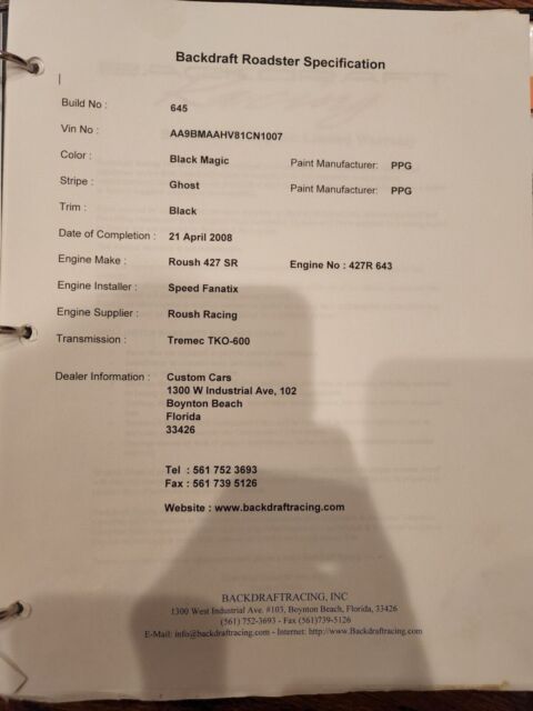 1965 Shelby Cobra Backdraft 427 SR Roush Edition. TKO 600, 5 Speed Manual Build by BDR and tuned by Speed Fanatix; Registered and title as a 1965 ...Easy registration and titling, no inspection needed in any state. Have the title and ready to go!Car is in great shape, as close to new as you are going to get. This is the Mercedes of Cobras!!! Car is very fast and handles very well. This is not a FFR garage built erector set; If you know BDR Racing, you know what you are getting and if you don't, educate yourself :) View Attached Pictures for complete specsHIGHLIGHTS:Color: Black Magic (Dark Gray) with Ghost StripesMotor: ROUSH Racing 427 SR V8 with Holly 770CFM carburetor, MSD Ignition (view pics for more details) LINK TO THE MOTOR: https://www.iconicparts.com/iconic-427-e-450hp.htmlTrans: TREMEC TKO600 5-Speed manual transmissionWheels: Polished and painted knock off wheels with tires that are less then 2 years old so not dry rotted and with amazing gripSuspension and brakes: BMW E36 with brand new parking brake cables and shoesPaper Work: Clean Title and all BDR build and spec book included Additional Equipment: -Top With Side Windows-Heater -Currently has a Sparco black leather steering wheel, original wooden one comes with the car as well if you prefer that look-Build/Spec Book from BDR for the car, the motor and all of the equipment in the vehicle-Lead hammer to take wheels off and safety wire kit to secure back on-carpeted trunk-floor matsCar must be paid in full within a week of the auction end. Deposit is not refundable. Can assist with shipping but you must arrange it and the car must be paid for and funds must clear before it goes. Maybe interested in trades.