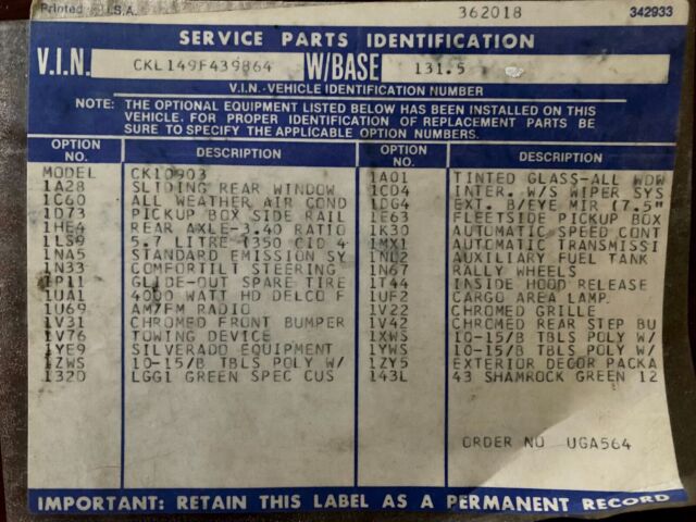*PLEASE REVIEW ALL OF THE FOLLOWING INFORMATION AND PHOTOS PRIOR TO BIDDING. PLEASE CALL SPECIALTY CARS TRUCKS AND CLASSICS AT 208-641-9852 WITH ANY AND ALL QUESTIONS YOU MAY HAVE PRIOR TO MAKING AN OFFER.*BIDDER REQUIREMENTS: WINNING BIDDER MUST MAKE A NON-REFUNDABLE $1000 DEPOSIT IMMEDIATELY UPON AUCTION CLOSE. FULL PAYMENT TO BE MADE WITHIN 3 BUSINESS DAYS OF AUCTION CLOSE VIA SECURE BANK WIRE TRANSFER OR BY CASHIER'S CHECK. PLEASE DO NOT BID ON THIS ITEM IF YOU DO NOT FULLY INTEND TO PURCHASE IT OR IF YOU ARE NOT ABLE TO PAY WITHIN THE ALLOTTED TIME. NO CREDIT CARD PAYMENT WILL BE ACCEPTED OVER THE DEPOSIT AMOUNT. PLEASE MESSAGE OR CALL DIRECTLY BEFORE BIDDING IF YOU HAVE A ZERO EBAY FEEDBACK SCORE OR YOUR BID WILL BE CANCELLED. THANK YOU.IF YOU PLAN TO FINANCE THIS VEHICLE, PLEASE HAVE YOUR FINANCING APPROVED PRIOR TO BIDDING.PLEASE SCROLL BELOW THE ITEM DESCRIPTION TO VIEW 85 FULL SIZE IMAGES OF THIS K10 SILVERADO.For sale is an absolutely beautiful 1979 Chevrolet K10 Silverado. This truck is equipped with its numbers matching TBF code 1979 350 engine mated to a three speed automatic transmission. This is fully loaded truck including notable features such as factory tach, tilt column, cruise control, A/C, intermittent wipers, cargo lamp, Silverado equipment, towing equipment and 3.40:1 rear axle ratio. This truck has remained in Northern Idaho for much of its life. The interior of this K10 is beautiful. The dash is a brand new steel-reinforced vinyl-wrapped foam unit and fits like the original. The headliner is also new along with the gauge bezel and various trim pieces throughout. A Retro Sound radio head unit is installed in the dash in the factory mounting holes and looks excellent. All of the factory options are working aside from the cruise control, which has been bi-passed. The A/C has just been converted to R-134A refrigerant and the fan speed control works in all positions. The exterior of this K10 looks incredible. The metallic green paint is striking and really pops in the sunlight. This truck was originally green and was repainted approximately 15 years ago. There are several small blemishes on the truck as seen in the photos, but are typical of the age of the paint. The body is very straight and the fenders, rockers, cab corners and besides are all solid and rust free. This truck runs and drives very well. The original 350 V8 was reportedly rebuilt around the time of the repaint with few miles since completion. The transmission shifts smoothly in all gears and the truck drives straight down the road. The ride quality is excellent. The truck is fitted with a new set of 31x10.50x15 Cooper Discoverer AT3 XLT tires on the factory rally wheels. Please call Specialty Cars Trucks and Classics at 208-641-9852 with any questions.