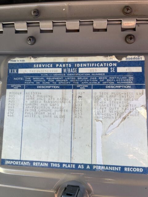 | Year: | 1972 | VIN (Vehicle Identification Number): | TKE1422Z513598 |