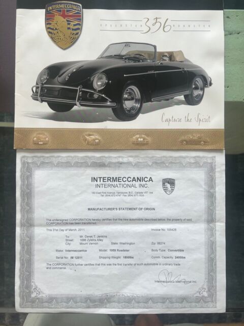 I have owned this little beauty since 2018. I am the third owner. I purchased it from a friend here in Naples who gave me the car history. The first owner, who lived in Washington State, owned several Intermeccanicaâs over the years. In early 2011, he commissioned Intermeccanica to build this one as close to an original 356 as possible, according to Henry Reisner, the owner of Intermeccanica. Sadly, the first owner died several months after he took possession of the car. His two daughters (both of whom also lived in the state of Washington) took ownership of the car through the will. One of the sisters also owned an Intermeccanica. According to the sisters, the car sat in storage from 2011 until November 2016, which is when he took possession of the car. The sisters told him that they took the car âout for a spinâ once in a while during the carâs hibernation. There were 2800 miles on the clock ( or 4500 kilometers- the speedometer and odometer are in kilos) on the clock when he took possession. This car has been a nice toy for my wife and I to cruise Naples and attend local car shows, we are selling to consolidate our car collection. She's a beauty! GENERAL INFORMATION: 1959 Porsche Roadster D Custom Built By Intermeccanica of British Columbia, Canada CUSTOM BUILD DATE: February 2011 MILEAGE: 5,850 REGISTRATION: Florida Antique Car COLOR: Lapis Blue POR 3A8w/Glasurit Base Clear INTERIOR: SEATS: Roadster seats with adjustable head rests UPHOLSTERY: Original style vinyl Tan CARPET: Square Weave Wool Tan TOP/BOOT COVER: Roadster Stayfast Black/Beige 1727FASTERNERS: Tenax Fasterners STANDARD FEATURES: Full Custom hand-built construction Intermeccanica-designed and fabricated-tube-steel chassis Original Convertible D windshield and top with large rear window for excellent top-up visibility/wind protection Intermeccanica designed Stayfast cloth top with zippered read window for optimum visibility and durability Original restoration grade detail and materials throughoutCanadian made one-piece, fully reinforced ISO resin composite body, box-section hood, trunk and doors Fully jig-bonded body and frame Oven post-cured body to guarantee fiberglass stability High-quality body preparation and paint, utilizing epoxy primer and Glasurit German acrylic urethane paint with full cut-polish finish MECHANICALS: ENGINE: VW Factory Type 1 /Base 1,600cc EXHAUST SYSTEM: Intermeccanica Custom âBig Pipeâ quiet SST tip TRANSAXLE: Intermeccanica VW Type 1 4-Speed, Base 4.12:1 final drive SUSPENSION: Intermeccanica Base, worm and rolling steering; 22mm torsion bars and gas shocks BRAKE SYSTEM: Intermeccanica Disc Brakes front drums rear; SST brake hoses WHEELS: 15x5.5 chrome Mangels with âMoonâ caps TIRES: Yokohama Avid Envigor 185/65-15 SPECIAL FEATURES: Euro 1959 chromed âshortâ bumper guards Original wool Square Weave Carpet Nardi 390mm wood steering wheel KPH speedometer Clarion AM/FM/CD/MP3 radio in painted original look radio pod with Clarion 3-way speakers Original style door handles with locking push button Chrome plated hood handles Chrome plated windshield frame with Reproduction 356 chrome washer nozzles Passenger side door mirror & Dash grab handle Breakerless HP ignition SST Oil LinesCustom spring plates with inboard ride height adjustment Trailing arm pivot point adjustability Auxiliary power port under dash Battery cut off switchIf you have any questions call and/or text Shawn at 317. 339. 1038. Sorry, not interested in trades. The vehicle is being sold âas isâ and purchaser will be responsible for shipping the vehicle at their own cost. The vehicle is being advertised locally, I reserve the right to end the auction early. Serious buyers only. Thank you.