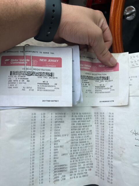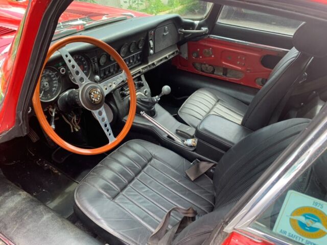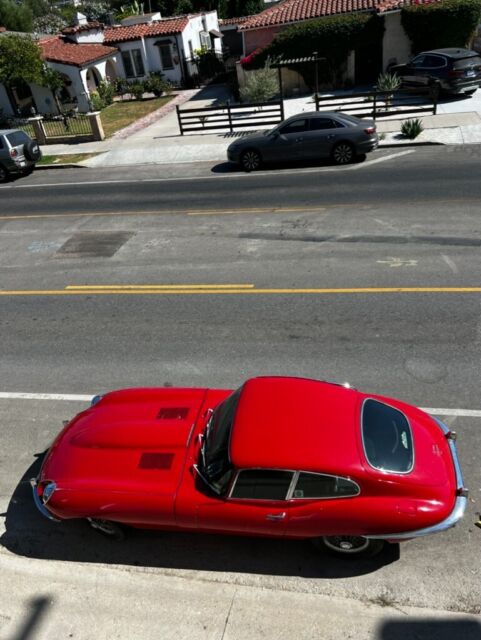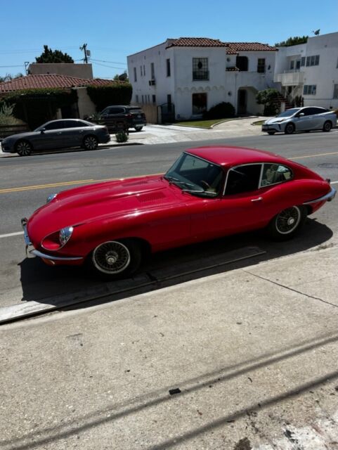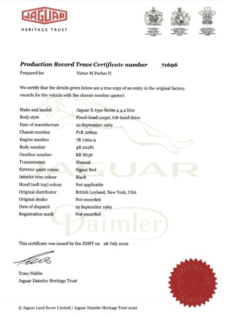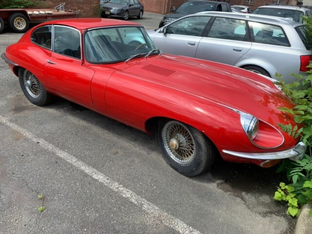 High-Level DetailsChassis: P1R2689963k Miles Shown, TMU4.2-Liter Inline-SixFour-Speed Manual TransmissionMatching NumbersSignal Red PaintBlack Leather UpholsteryFactory Power SteeringFactory Air Conditioning Chrome-Finished 15" Wire WheelsDual Stromberg CarburetorsWood-Rimmed Steering WheelDual Exhaust SystemDisc BrakesChrome Bumpers w/OverridersLarge Parts LotOwner's ManualService and Refurbishment RecordsThis 1969 Jaguar E-Type/XKE is a Series 2 fixed-head coupe in Signal Red purchased by the current owner from a seller who had recently acquired a lot of Jaguars from a widow. The odometer reads 63,456 miles, which is assumed to be original based on the engineâs condition. This vehicle is a âscruffyâ driver or a driving project car for others. Per the Jaguar Daimler Heritage Trust, 1,047 LHD E-Type Series 2s produced in Signal Red, 202 fixed head coupes, were dispatched to the USA; the total is 807, of which there were 153 fixed head coupes. According to historical books, only 577 LHD FHCs left the factory with the âPâ (power steering) prefix. All of this only adds to the rarity of this gem of a car. The car has a four-speed manual transmission, a dual exhaust system, chrome 15â³ wire wheels, power steering, air conditioning, a wood-rimmed steering wheel, and an aftermarket AM/FM cassette radio. It appears to have been the subject of a mechanical and cosmetic refurbishment circa Summer/Fall 2000 after finding OSJI markings on the door panels dated 09/14/2000. In August 2022, service and repairs included replacing the clutch master cylinder, clutch hose, master slave, battery, tires, cooling system hoses, alternator belt, fluid flush, and refill. Also, in April 2019, East Coast Jaguar, Inc. (Wilmington, DE) completed extensive maintenance and repairs. This E-Type/XKE coupe is now offered with an ownerâs manual, a Jaguar Daimler Heritage Trust certificate, service records, a workshop manual, a substantial parts lot (see below), and more.The vehicle runs and drives. It was intended to be a daily runabout 20-30 miles per week, which only makes sense in the warm Southern Californian climate. The door panels and some exterior brightwork have been removed for cleaning/polishing, but they can be reinstalled upon request. Bubbling paint, minor dents, and paint chips are noted around the vehicle. The driver and passenger floor pans are rusted but feel sturdy. Please look at the close-up photos of exterior imperfections, which are documented in the pictures (additional images are available upon request).Please find an abridged list as follows:Borg-Warner auto trans w/attached speedometer drive (S1-S2 2+2), S1.5 (OTS) cylinder head with cams and valve assemblies, original wire wheels (four-wheel set), NOS Smith gauges in original boxes (marked with 25-yr old prices of $105 and $115), complete S1.5-S2 instrument cluster with wiring, Triplex headlight glass and chrome surround, Trico wiper blade(s) with windshield wiper mechanisms, rear quarter Sundym window set (FHC), very good/excellent condition factory S1-S2 OTS/roadster tonneau cover, S1-S2 complete dash panels, âpicture frameâ assembled, S1 and S2 electric cooling fans, and more.