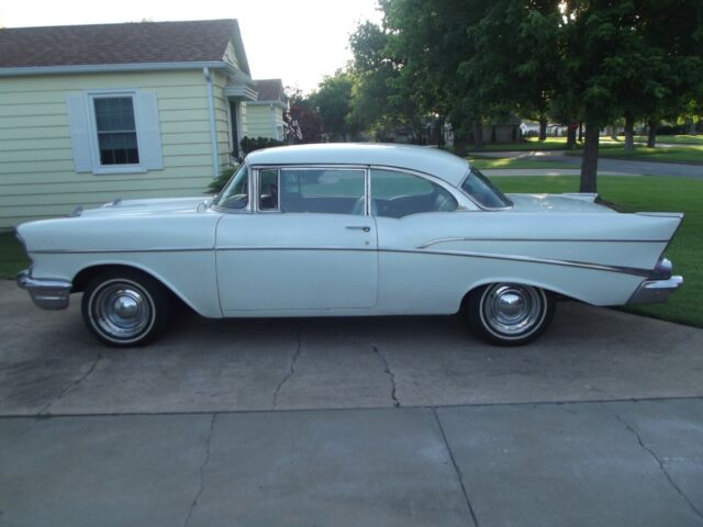 57 CHEV 210 SMALL BLOCK V8 2DR HT-WHITE DIAMOND PEARL PAINT-MUNCIE 4 SPD TRANSMISSION. RUNS GOOD-NO LEAKS-NO EXHAUST LEAKS-90% TIRES- VERY NICE DRIVER QUALITY VEHICLE-ABOUT 5000 MILESS ON ENGINE REBUILD-USES NO OIL-GLASS IS VERY GOOD-VERY SMALL 2INCH CRACK IN DRIVER AND PASSENGER DOOR UPPER CORNER. NOT NOTICEABLE. NO OTHER CRACKS. NO BODY RUST-FLOORS BEEN ...